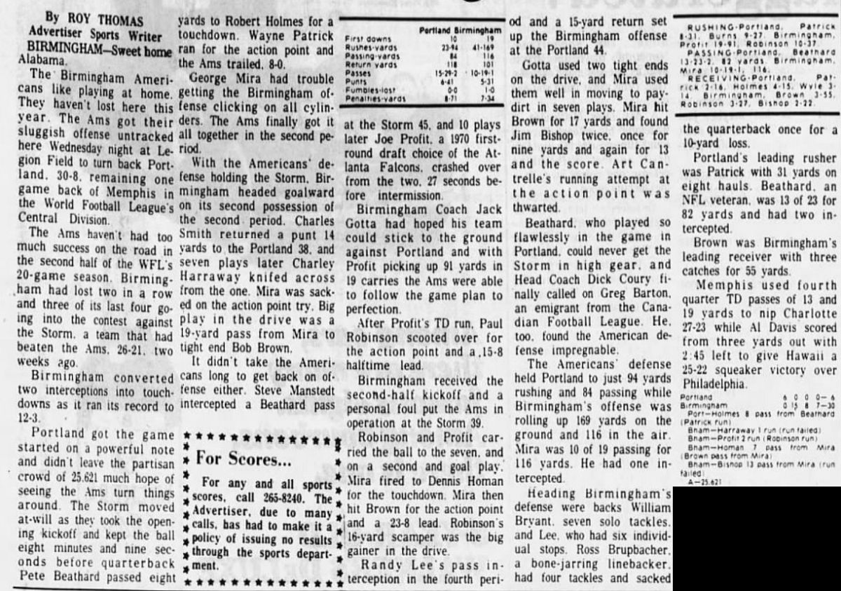 1974, October 9th: Portland Storm 08 @ Birmingham Americans 30 (12-3)